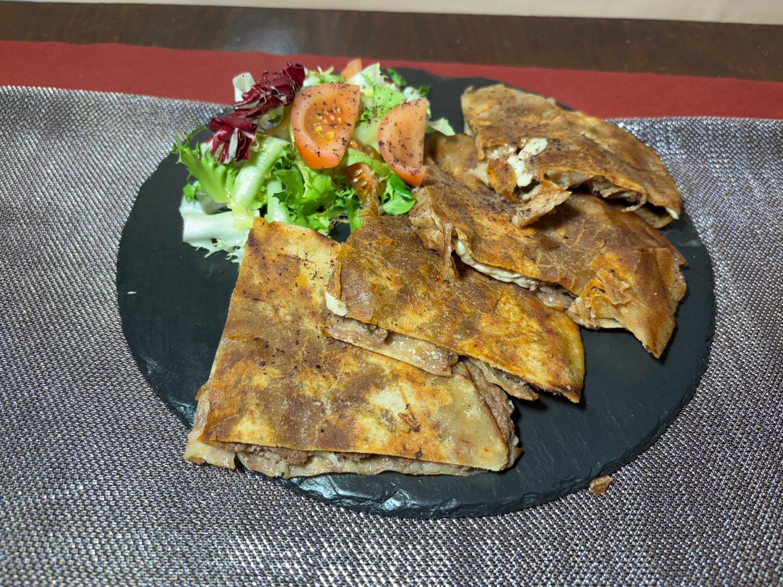 Grilled (crispy) Lebanese bread (pita) previously stuffed with cheese, meat, potatoes, Muhammara OR eggplant.