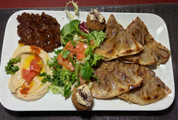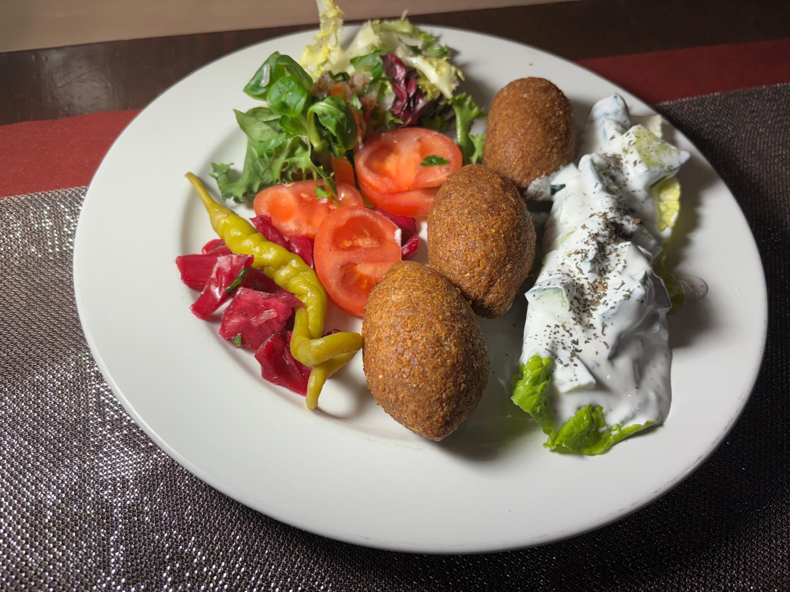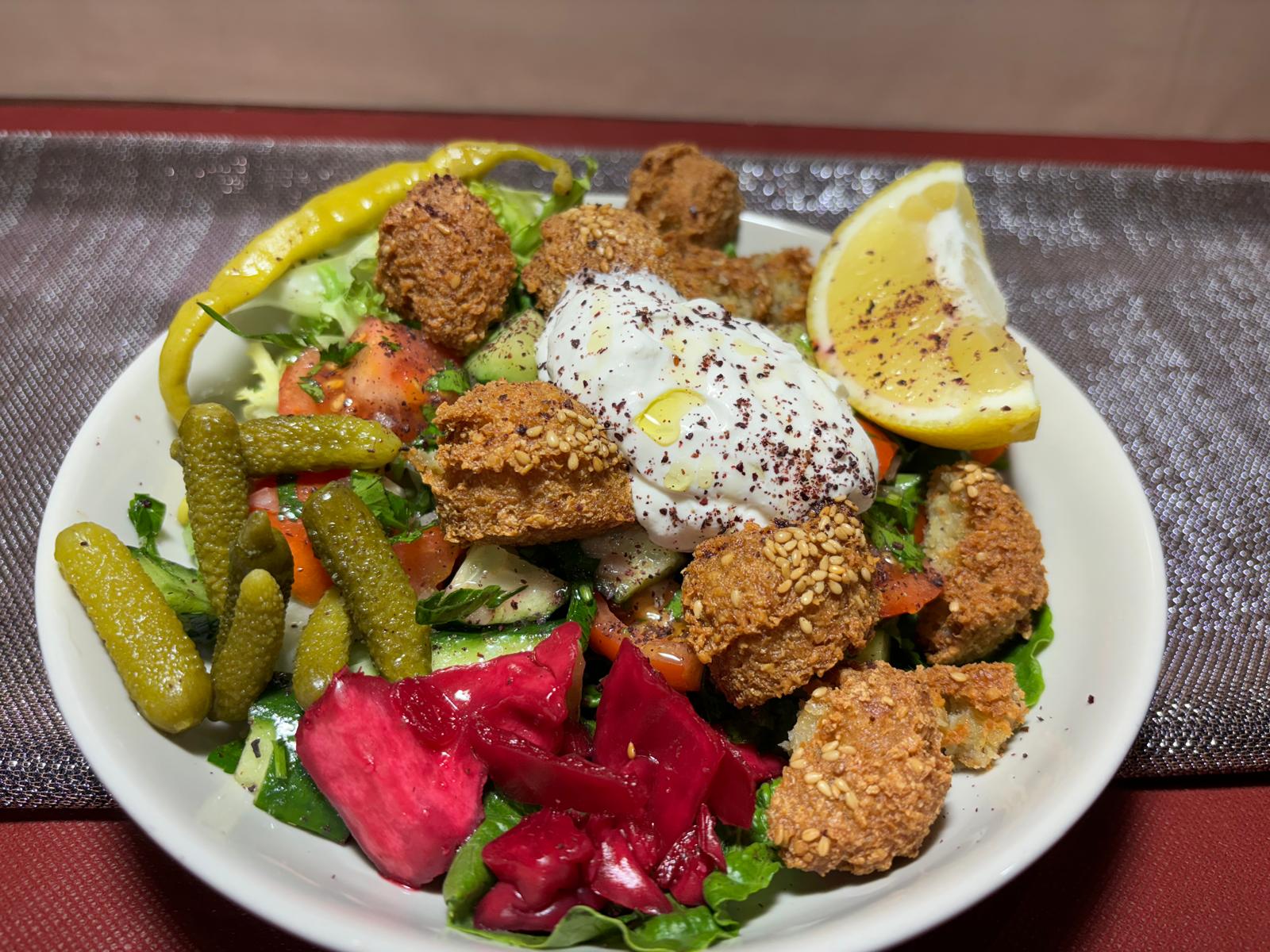 Arrays (your choice) with salad, falafel, hummus and another cream of your choice.