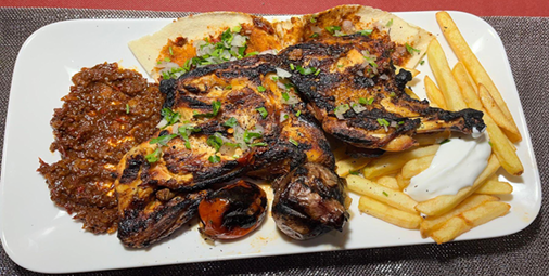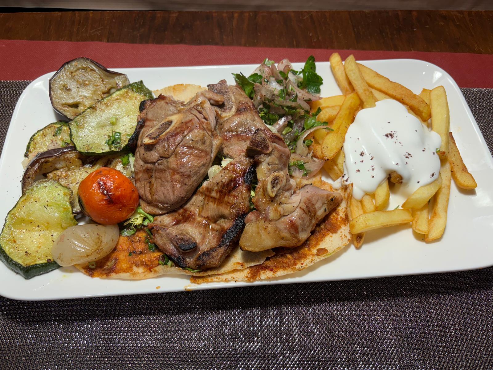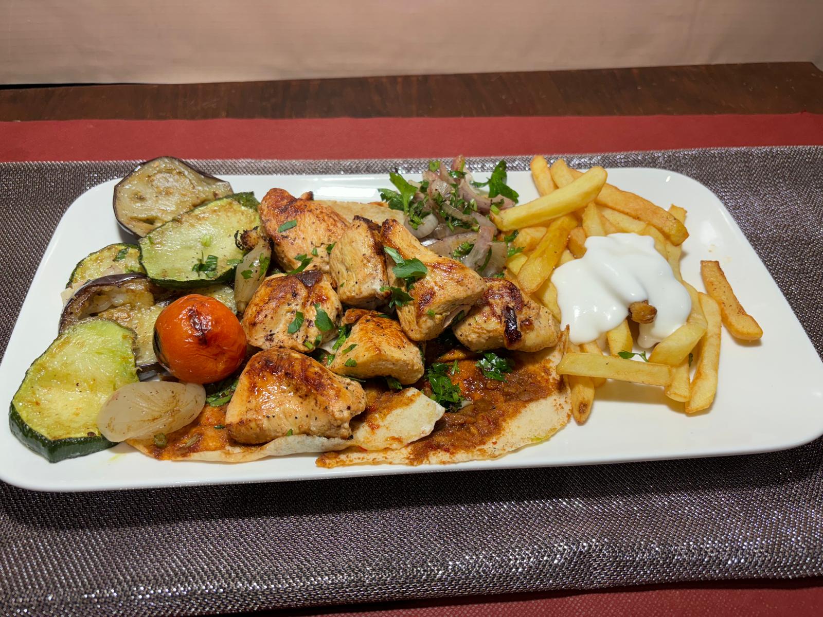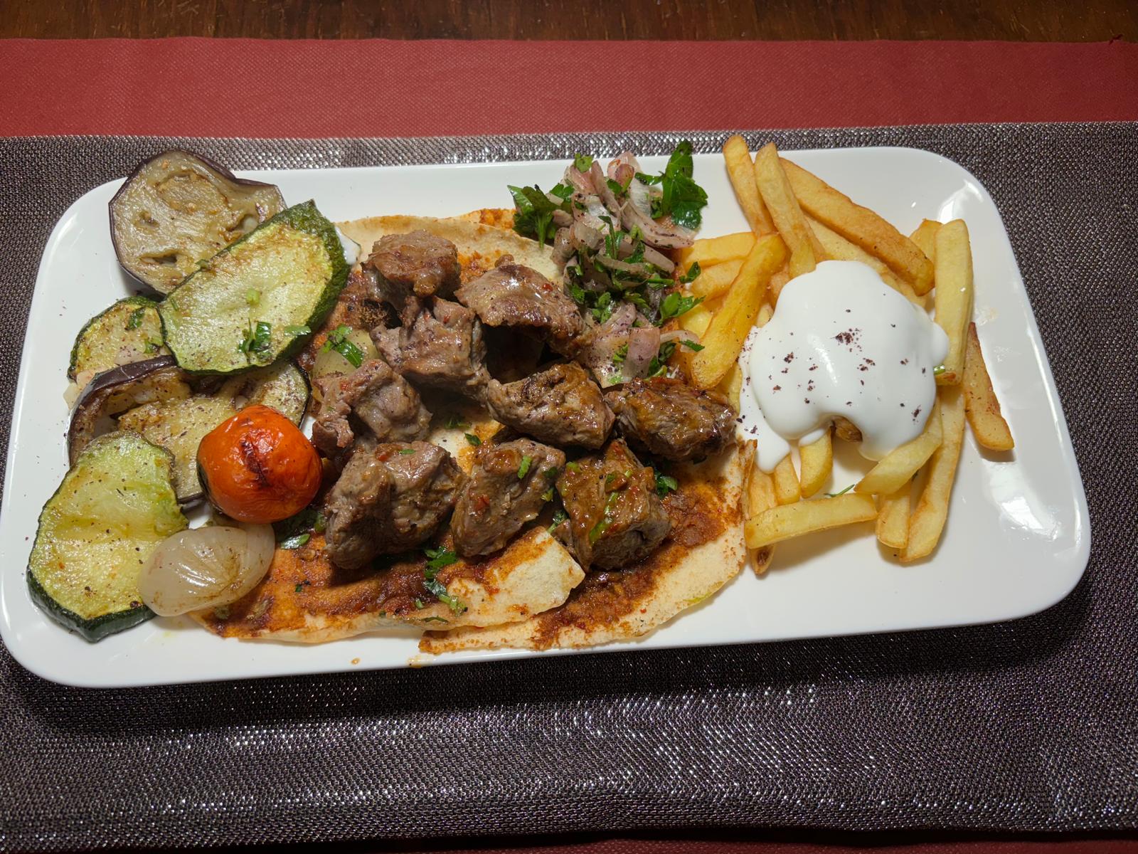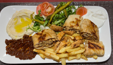 Chicken or beef Shawerma with salad, potatoes, aioli and a cream of your choice.