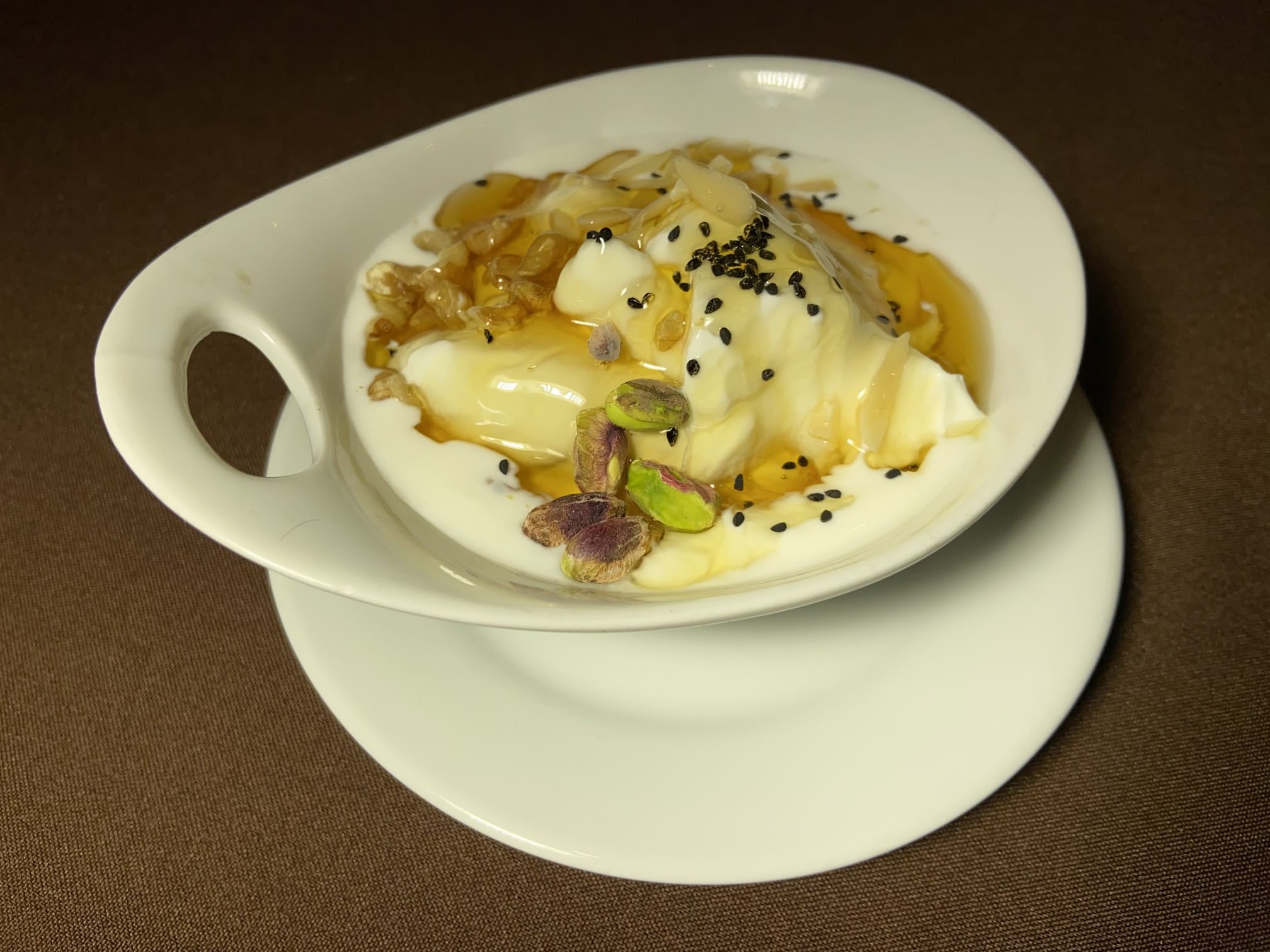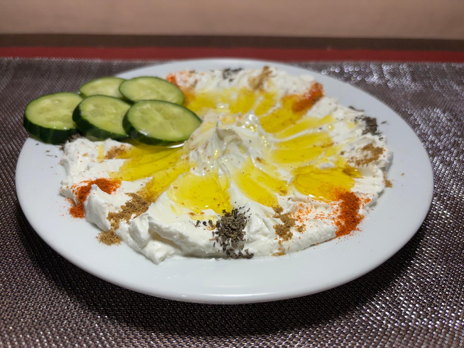 Homemade yogurt cream presented with aromatic spices and olive oil.
