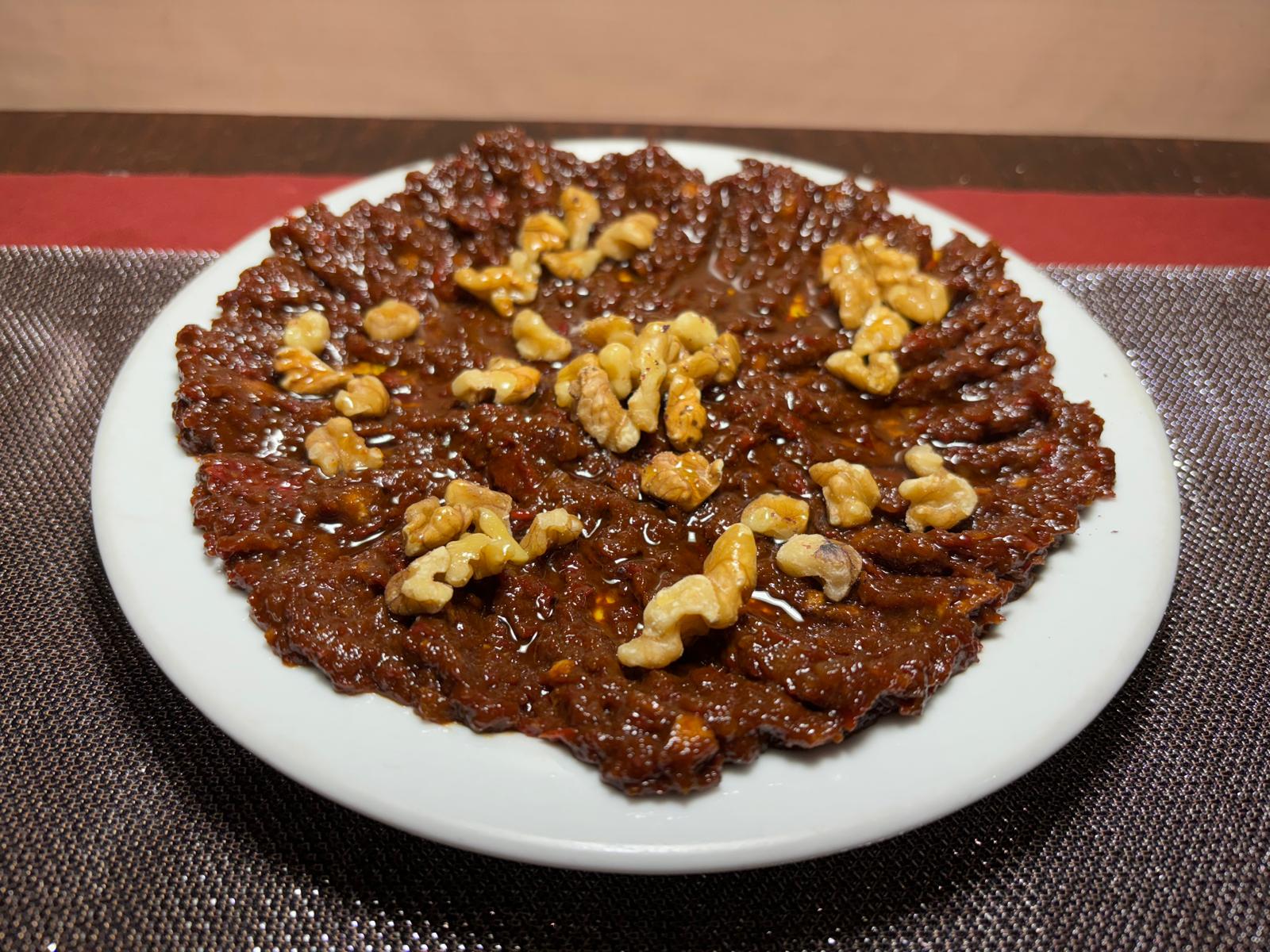Tartare of roasted red peppers, walnuts, pomegranate molasses and olive oil.