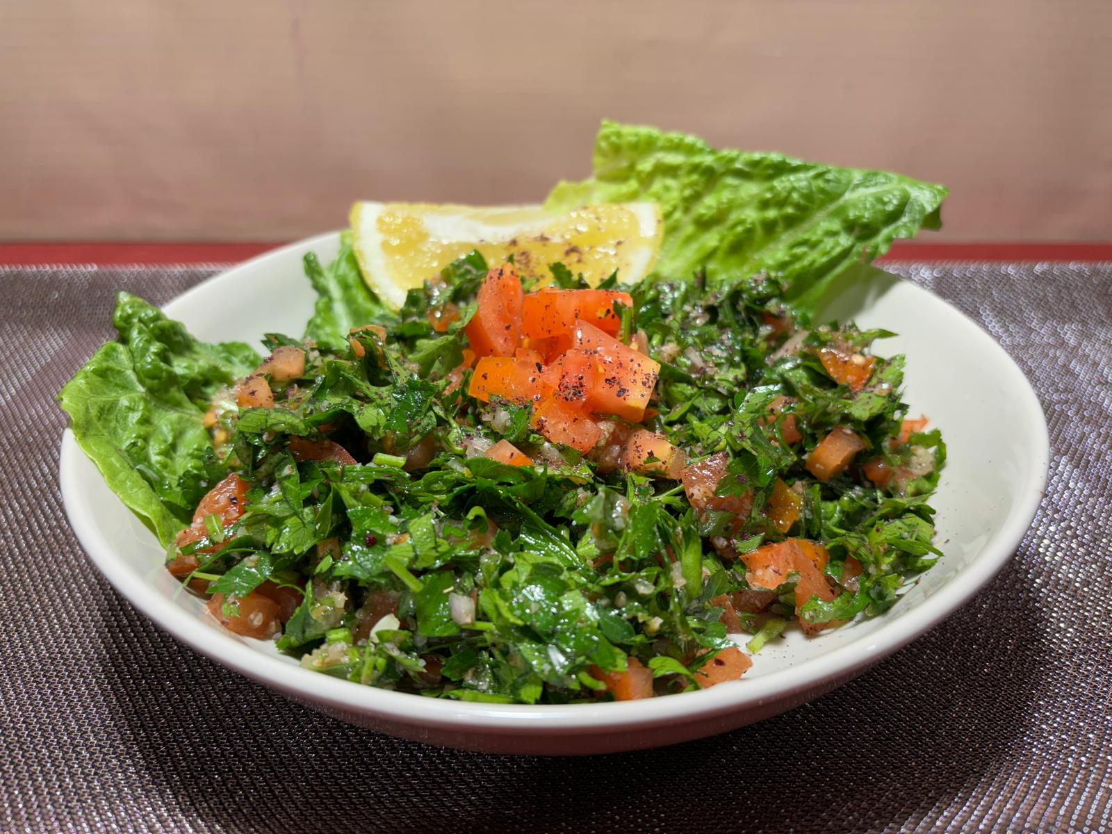 Parsley, onion, tomato and mint, finely chopped, and mixed with Brugul (Lebanese semolina) and all marinated in olive oil and lemon juice.