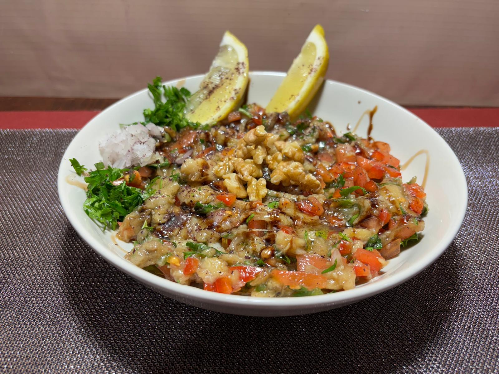 Roasted eggplant tartare with Tahini sauce, lemon juice, olive oil and walnuts.